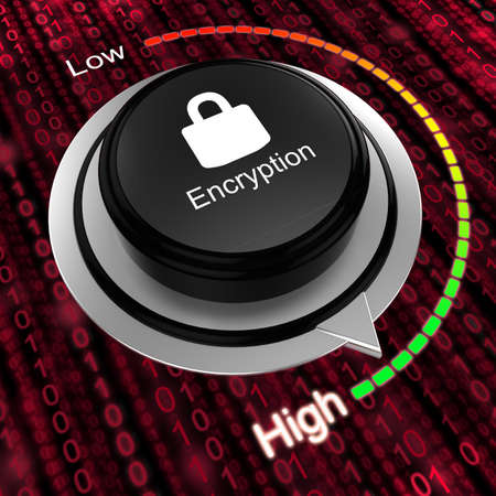 Rotary knob with the word encryption and a padlock turned to high on a red digital data stream background 3D illustration