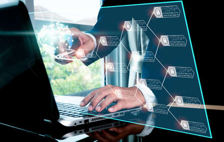 Blockchain technology concept depicted with a chain diagram and encrypted blocks. A businessman's hand working with a new modern computer, as well as a diagram of business strategy and social media.