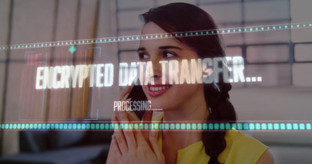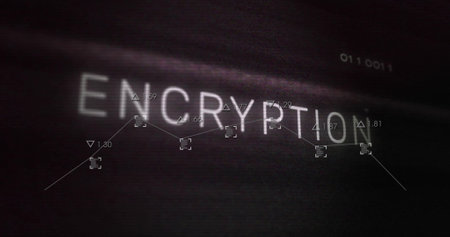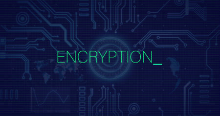 Image of encryption text banner over binary coding and microprocessor connections. Computer interface and cyber security technology concept