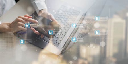 Data encryption online cyber security privacy concept. Padlock icon and internet technology networking. Businessman holding a laptop with encrypted protecting data personal on the network