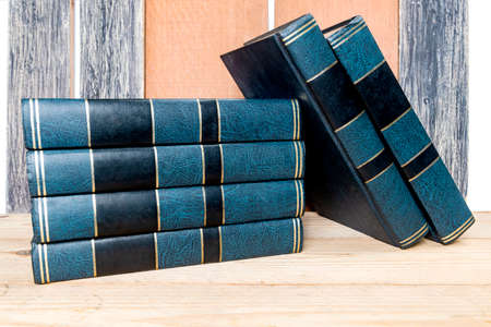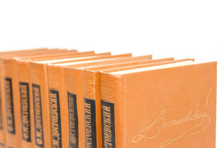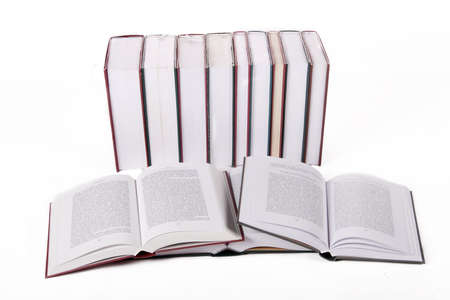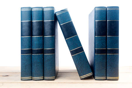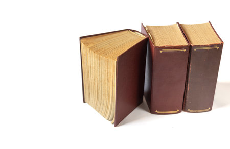 Old books are arranged in a row on white background. perspective view, background, closeup.