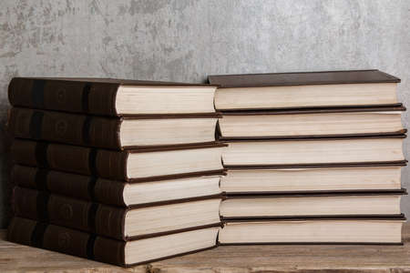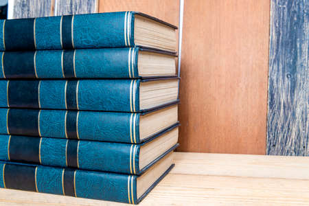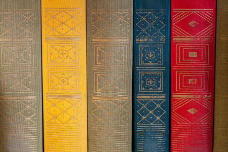 Old books on a shelf, overhead shot. Classic literature in a second-hand bookshop, Victorian novels