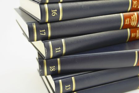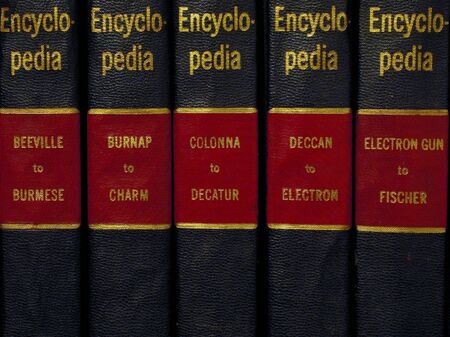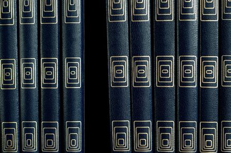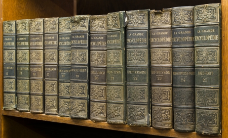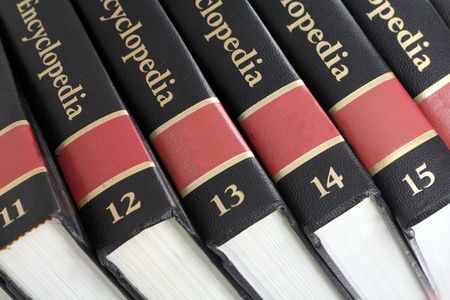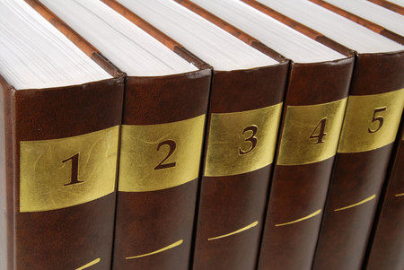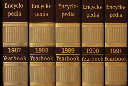 Numbered encyclopedia books placed on a wooden shelf, where the silhouette of the books is reflected