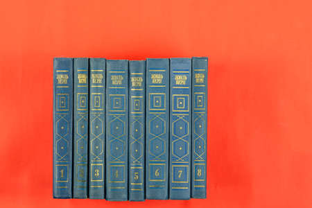 Books of classical literature on a red background. Collected Works of Jules Verne in 8 volumes. Hardcover books in Russian. Kiev, Ukraine - 04 27 2021