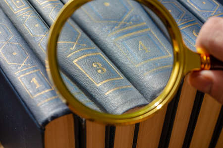 A man looks at a lot of books through a magnifying glass. A hand with a loupe. A multi-volume numbered literary collection of literature. Close-up. Selective focus.