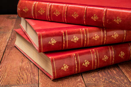 stack of antique books with red leather spin and golden ornaments on a rustic wooden table