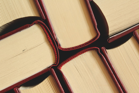 Top view of the books. Paper publications stacked on a pile. Dark background.