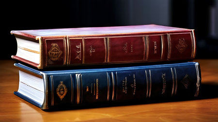 A stack of two classic hardcover books placed on a wooden table, showcasing their elegant spines and gold embossing.