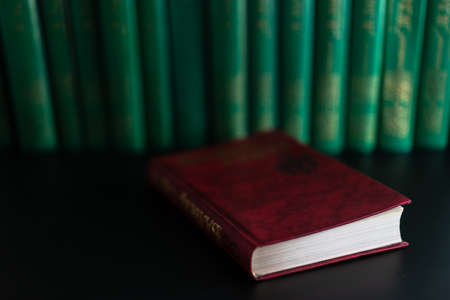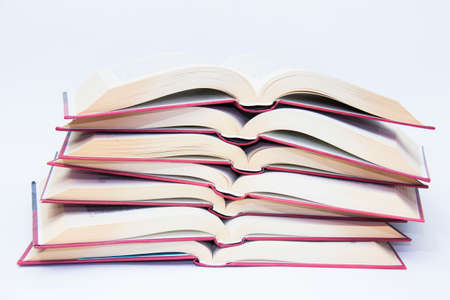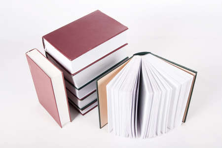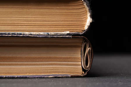 Open book on a stack of books on a table on a dark background. Education and reading of paper books. Exam preparation in schools and colleges