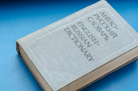 Hardcover book on a blue background. English-Russian Dictionary. Education, learning foreign languages concept.