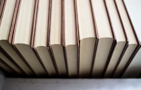 Close-up of book stack. Several colorful books with selective focus. Education concept