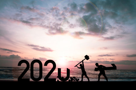 Silhouette man smashing 2020 year and one man carrying number one to prepare 2021 year on beach side. Preparation happy new year to plan and starting new life and new business concept.