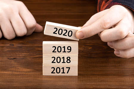 2020 New year on wooden background. Typography, numbers on blocks over wood texture background, flat lay style. Goals setting and new year resolutions concepts.