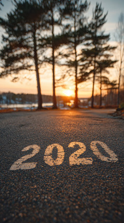 An asphalt road features painted numerals denoting the year 2020. The scene includes silhouetted trees against a vibrant sunset. The lighting creates a dramatic contrast with potential use in illustrative projects or concepts related to time, progression, and the environment. Suitable for editorial and commercial use.