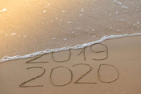 Inscription 2019 and 2020 on beach sand, wave covering 2019 digits. New Year 2020 coming concept