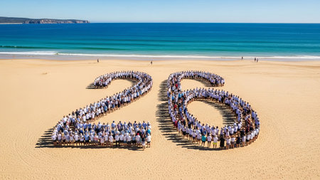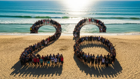Diverse people form number 26 on beach, ocean background.