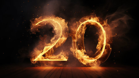 Close-up image of the number twenty, rendered in a 3D design style, with a textured metallic appearance and vibrant orange and purple hues. Water droplets and sparks add a dynamic, glowing effect to the image.