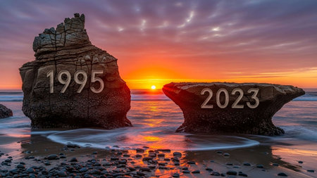 Beautiful sunset over the sea and rocks with the number of years
