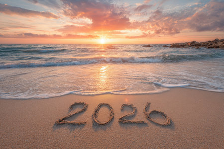 Year 2026 is carved in soft sand at a beach, illuminated by a stunning sunset and nearby waves lapping gently at the shore.