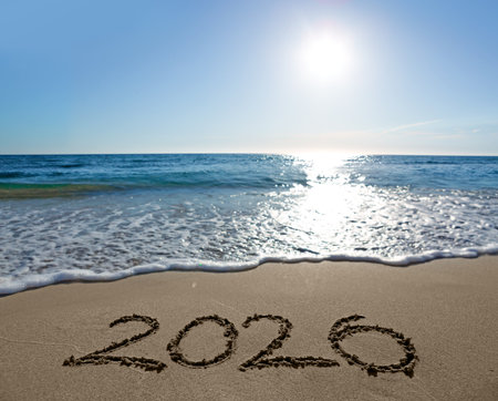 2020 written in the sand on a sunny beach with calm sea and clear blue sky. new year and new years eve concept