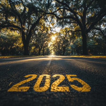 Road To 2025, New Year, Fresh Start, Asphalt Road, Tree Lined Street, Golden Sunlight