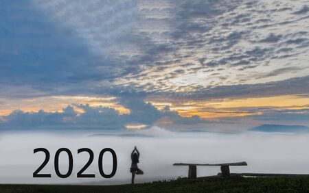 The abstract silhouette 2020 with woman stand exercise yoga, the beautiful sky cloud mountain view background.