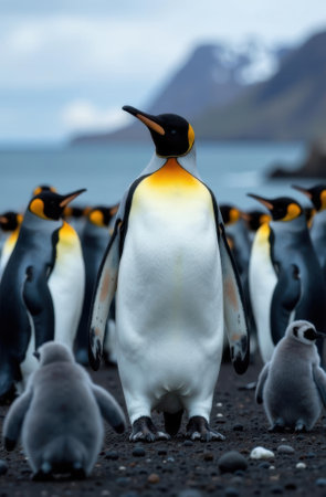King penguin standing proudly among its colony on a black sand beach, with adorable chicks nearby, showcasing the vibrant colors and social nature of these majestic birds in their natural habitat