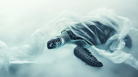 A sea turtle is unfortunately trapped in a plastic bag, emphasizing the urgent need for wildlife conservation and the impact of ocean pollution on marine life.