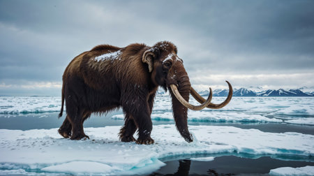 Majestic woolly mammoth standing on ice floes against snowy mountains backdrop.