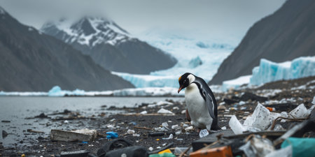 AI Generated. Penguin Standing Amidst Garbage on a Rocky Shore with Ice in the Background