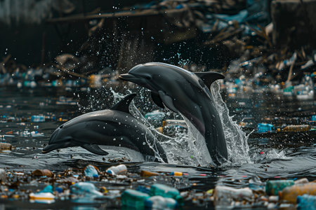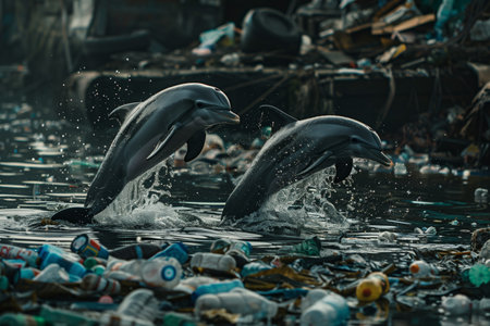 Two dolphins are jumping out of the water in a polluted ocean. The scene is a reminder of the impact of pollution on marine life