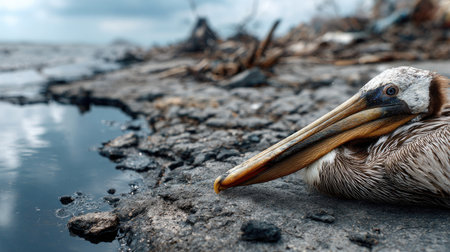 A brown pelican rests by the shore, surrounded by a rocky landscape and calm water, evoking a sense of peace amidst nature's beauty and fragility.