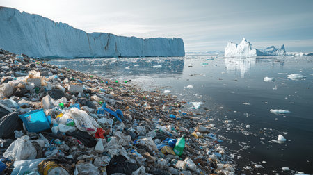 Plastic waste accumulation along icy shoreline reveals environmental crisis in Arctic region where melting ice exposes pollution in remote areas
