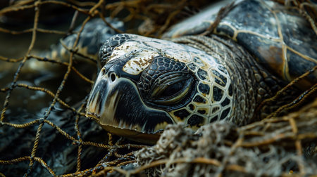 Trapped dolphin with calm expression caught in net, portraying marine conservation, entanglement, and environmental challenges.