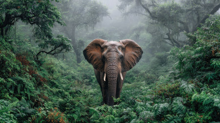 A magnificent elephant stands gracefully in the heart of a lush green forest, surrounded by vibrant foliage and a tranquil mist. This captivating wildlife scene embodies the beauty of nature.