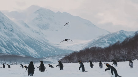 A stunning view capturing emperor penguins navigating a snowy landscape with majestic mountains in the background, illustrating the beauty of wildlife in its natural habitat.