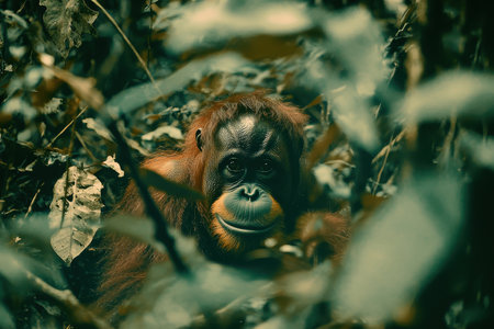In the heart of a tropical rainforest, an orangutan sits among thick green leaves. Its serene expression reflects a moment of tranquility in the vibrant ecosystem.