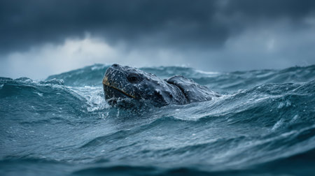 A large leatherback sea turtle emerges from the turbulent blue ocean waves, its ancient head tilted upwards. Dark, stormy clouds loom in the background, highlighting the raw power of nature.
