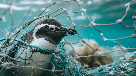 Marine plastic pollution and nature conservation concept, penguin trapped in plastic net