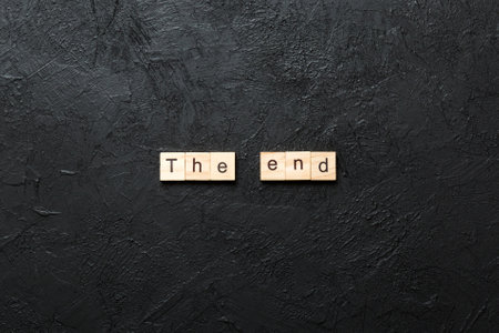 The end word written on wood block. The end text on cement table for your design, concept.