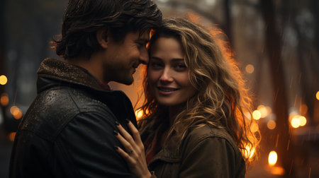 A joyful couple shares a close moment, both beaming with genuine smiles. They appear to be in an outdoor setting, possibly at dusk, with soft bokeh lights in the background.