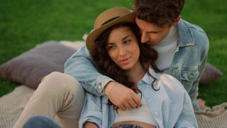 Closeup positive man and woman hugging and talking in summer park. Sensual couple showing tenderness on romantic dating at picnic. Youngt people lying on blanket outdoors and spending time together