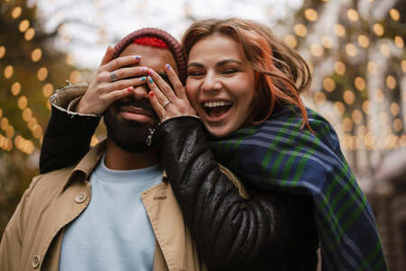 Multinational beautiful joyful couple smiling and warming their hands at city street