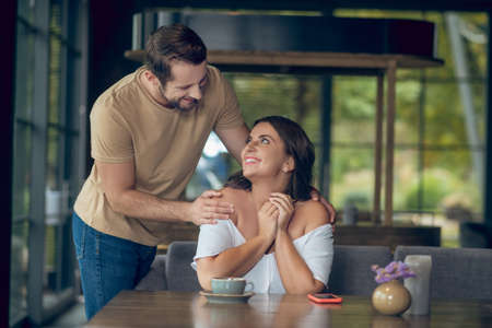 Meeting, hug. Smiling caring man hugging shoulders of joyful woman with long hair sitting at table in cafe