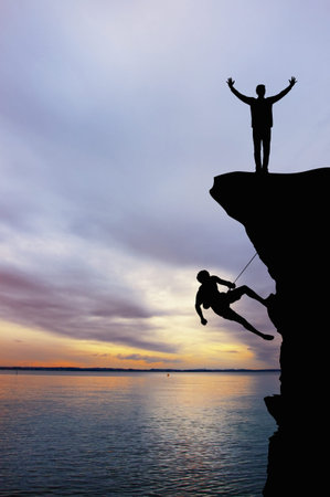 friends helping each other and with teamwork trying to reach the top of the mountains during wonderful summer sunset.