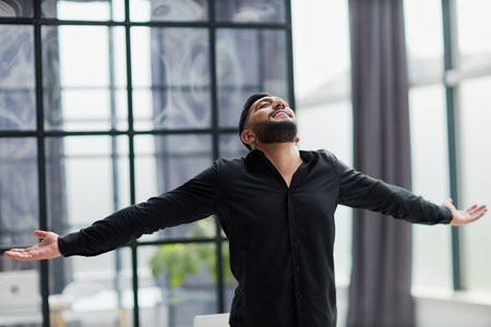 Shot of group of successful smart business team celebrating good job while holding up their right hands on coworking place.
