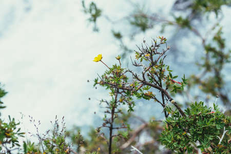Sunny nature background with small yellow flowers of cinquefoil above bokeh of clear azure water stream in sunlight. Yellow small flowers of dasiphora fruticosa above shiny blue mountain creek in blur