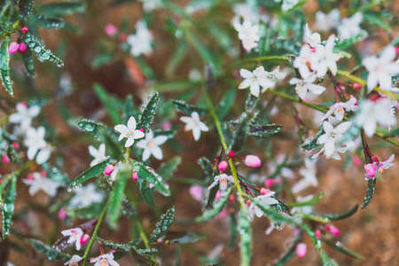 native Australian philotheca plant with tiny white flowers outdoor in beautiful tropical backyard shot at shallow depth of field