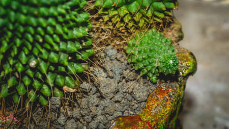 Beautiful cluster of picturesque prickly succulents among stones close-up. Rocky survivable all-season plants in macro photography. Mountain cacti in wild nature.