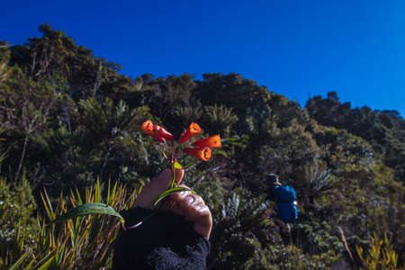 horizontal shot of a hand holding some wild flowers on a sunny day among the vegetation of the mountains of Costa Rica